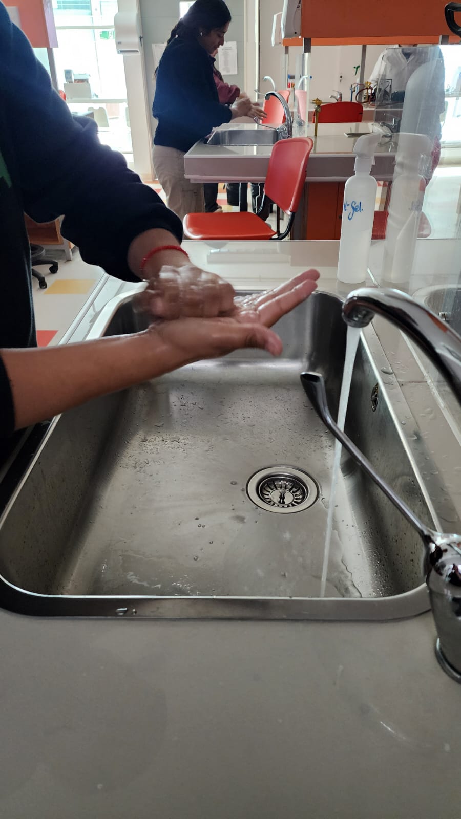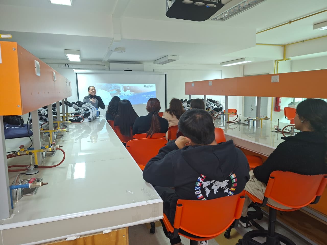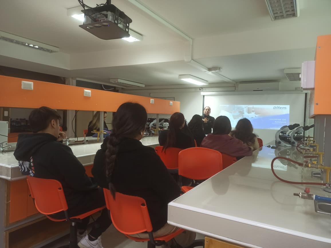 Durante la jornada, las participantes asistieron a una clase sobre higienización de manos, un taller práctico, y un control con máquina de fluorescencia, que permitió evaluar de forma interactiva la efectividad del lavado de manos.